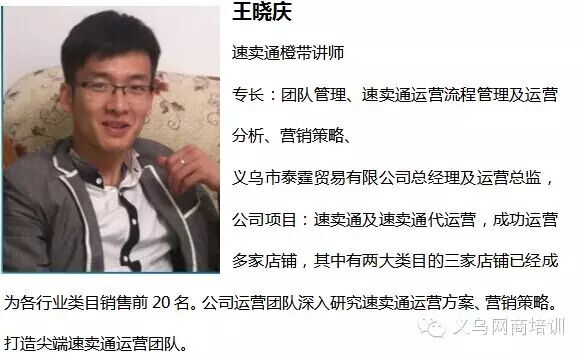 义乌网商学院是义乌市政府指定的电子商务培训机构,学院一直以“帮助义乌广大电子商务卖家快速系统掌握跨境电子商务知识和规则,促卖家成长,助货通全球”为理念,积极响应义乌市政府大力发展跨境电商政策号召,为义乌培养跨境电商人才贡献自己一份力量。义乌网商学院2014年推出了跨境电商培训孵化计划,第一期就是速卖通的培训。为确保培训效果,学院将配置经验丰富的实战型卖家讲师,官方专家型顾问,平台小二运营专家,全方位为义乌卖家进行实战培训。